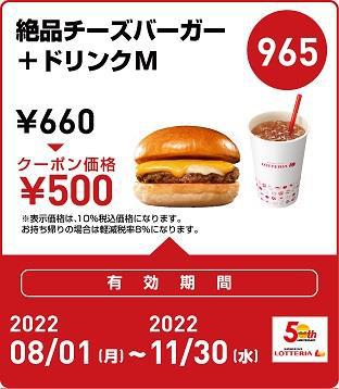 対象商品が「絶品チーズバーガー+ドリンク M」のクーポンは、通常価格660円(税込)が、500円(税込)に。
