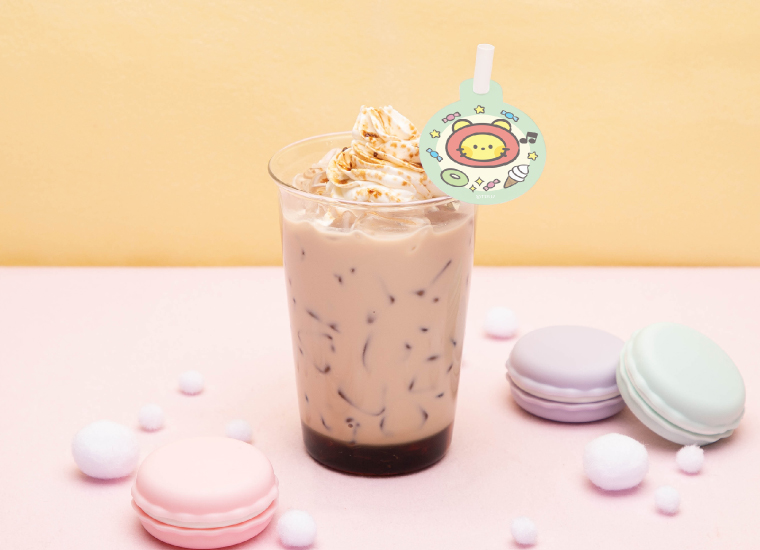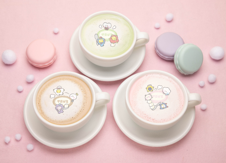 カフェラテには「CHILLI」「ROMY」「YOCHI」、抹茶ラテには「LAWOO」「BONBON」「HIKUN」、いちごラテには「SOM」「RURU」「WOOPY」「PODONG」の絵柄が浮かんでいます。