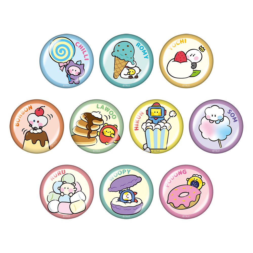 「TRUZ minini」のイラストとそれぞれの名前が書かれた缶バッジ。