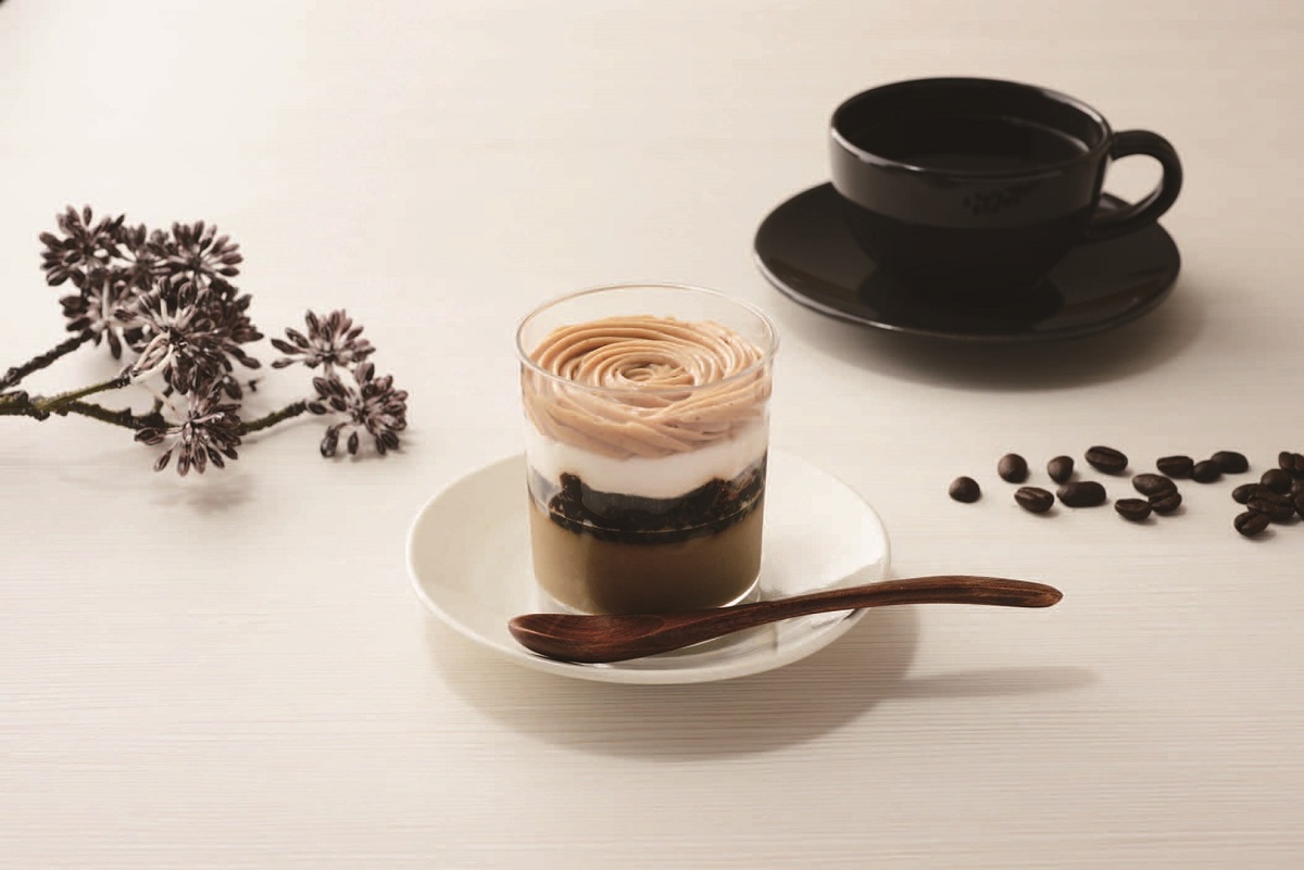ほろ苦いコーヒージュレ、パリッとした食感のチョコチップ、ホイップクリーム、なめらかなマロンクリームを重ねました。