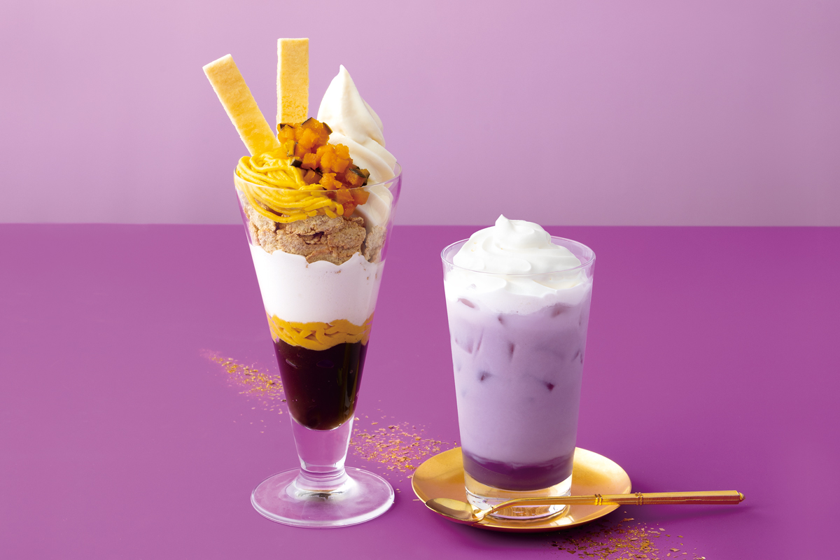 「かぼちゃのモンブランパフェ」「紫いもラテ」は、秋の味覚のほっこりとした味を楽しめるメニュー。