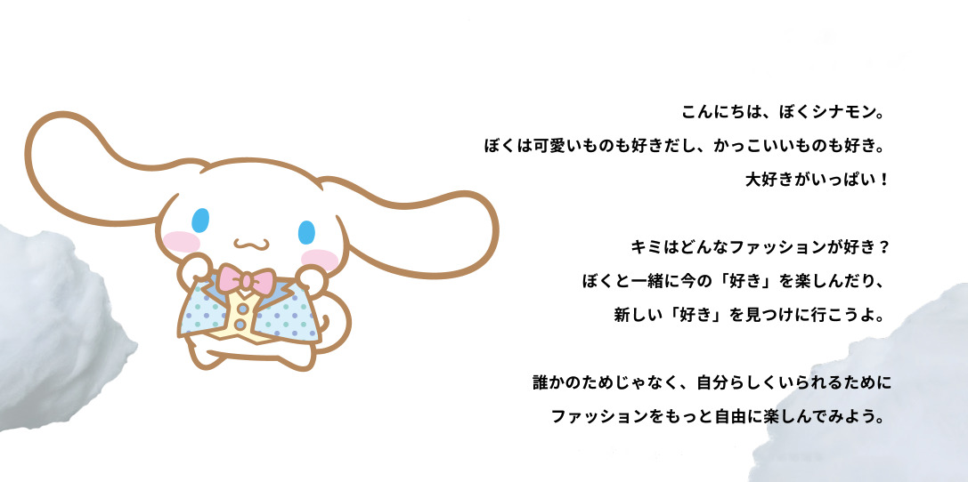 「シナモロール」は男のコでありながらも、耳や洋服にリボンをつけてお洒落をしたり、かわいいやかっこいいの概念にとらわれず自分自身が「大好き」と思える多種多様なファッションを楽しむことで、自分らしさを表現しています。