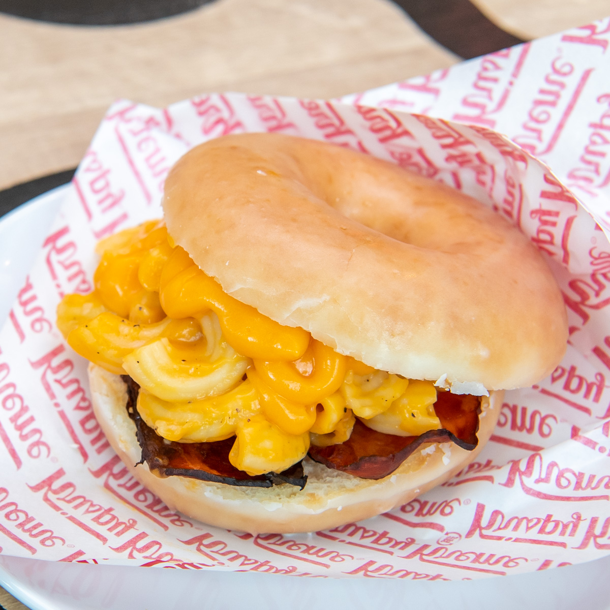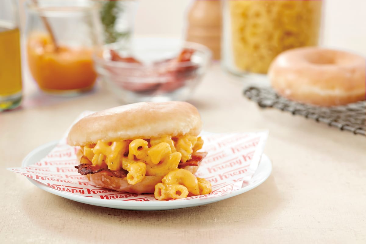ブラックペッパーが効いたチェダーチーズソースのマカロニと塩味の効いたベーコンをはさんだ、食べごたえあるドーナツバーガー。