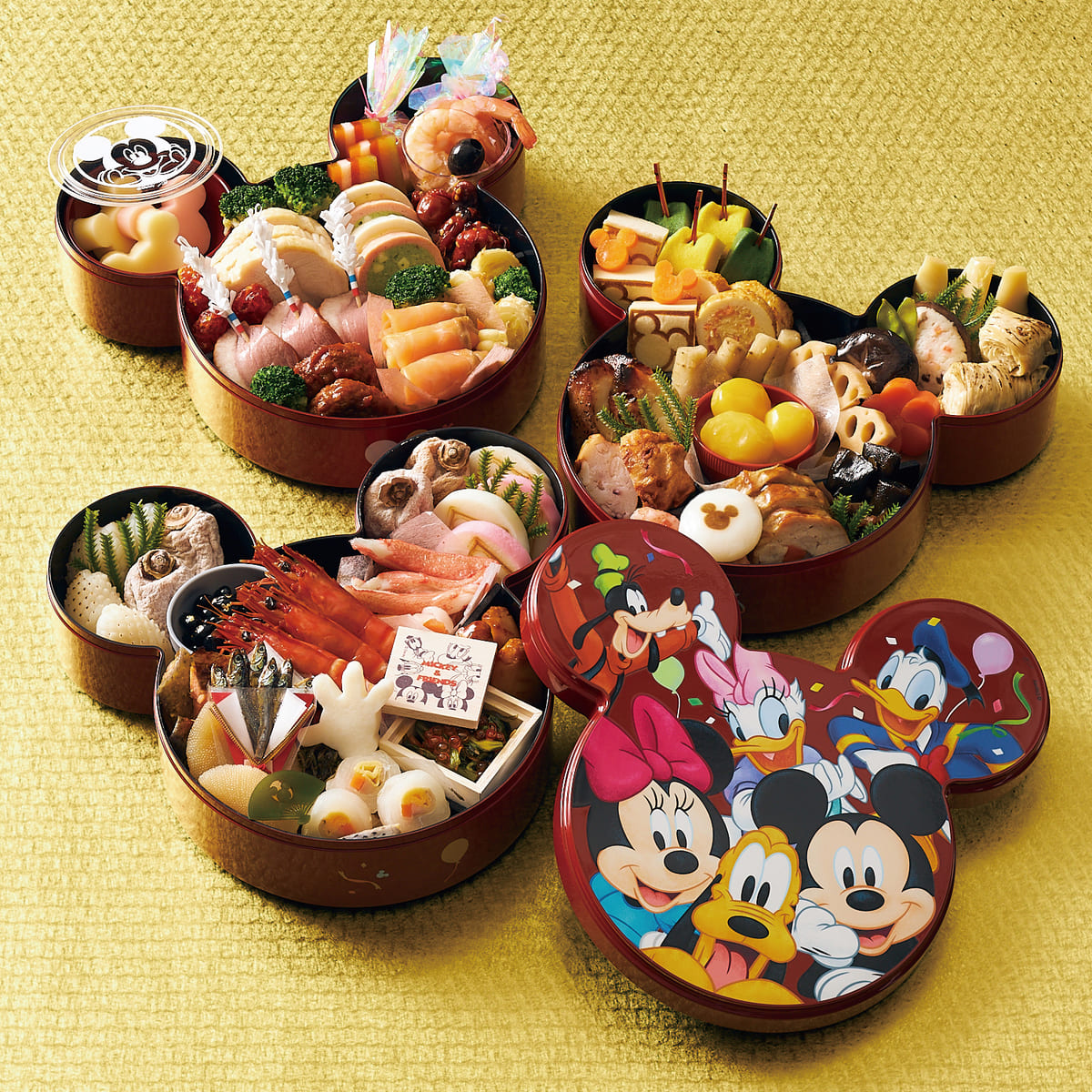 お重を金色に仕上げ「ミッキーマウス」「ミニーマウス」「ドナルドダック」「デイジーダック」「プルート」「グーフィー」のキャラクターデザインをオリジナルで描き起こした限定仕様!