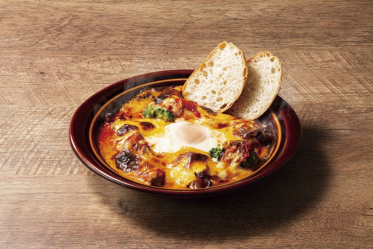 トマトソースの酸味と甘味、芳醇なチーズが素材の味を引き立てます。半熟たまごをからめれば、よりマイルドな味わいが楽しめます。
