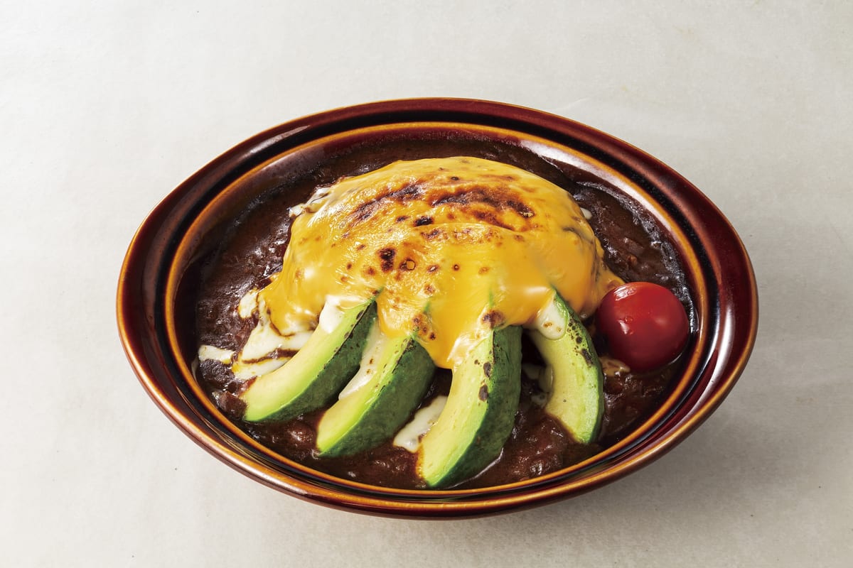 デニーズで大人気のハンバーグカレードリアに、メキシカンなテイストをプラスして、 アボカド、プチトマト、チェダーチーズをのせて、風味豊かに焼き上げています。