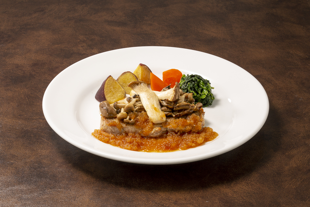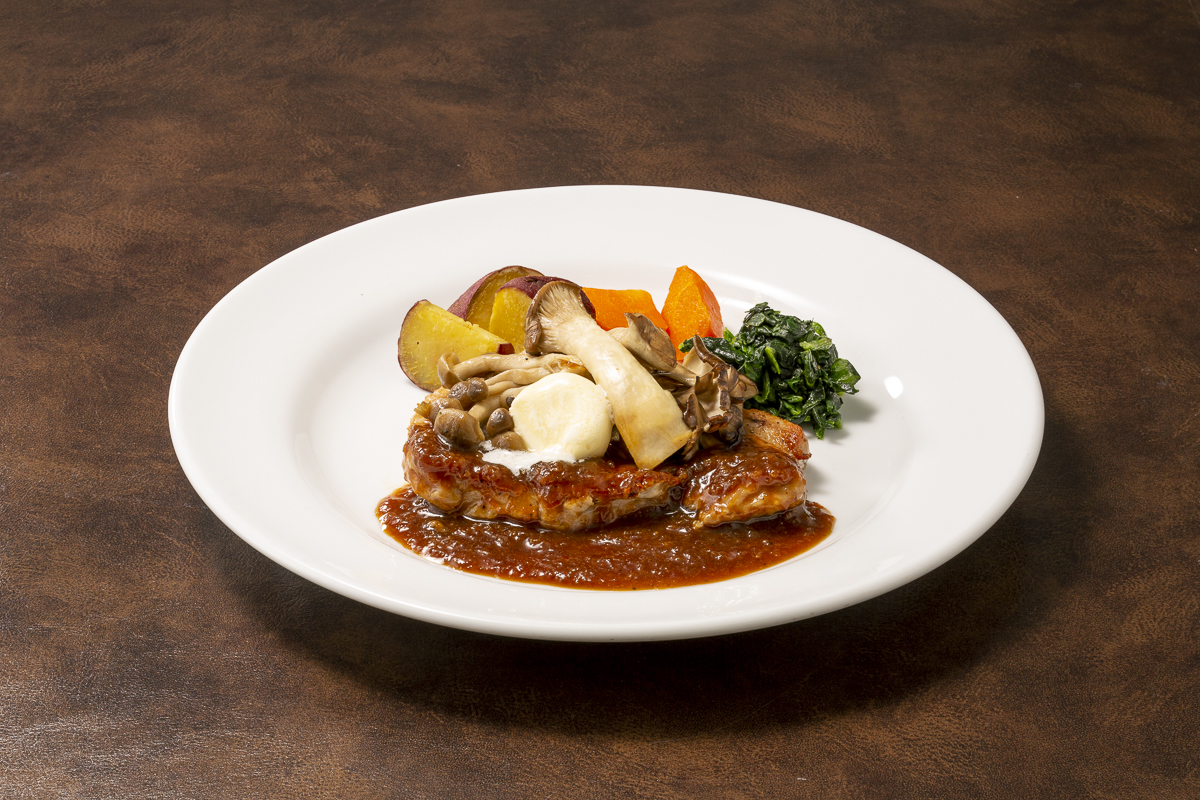 ジューシーに焼き上げた豚のロース肉に、きのことさつまいもをトッピングした、見た目にも秋を感じさせるひと皿。