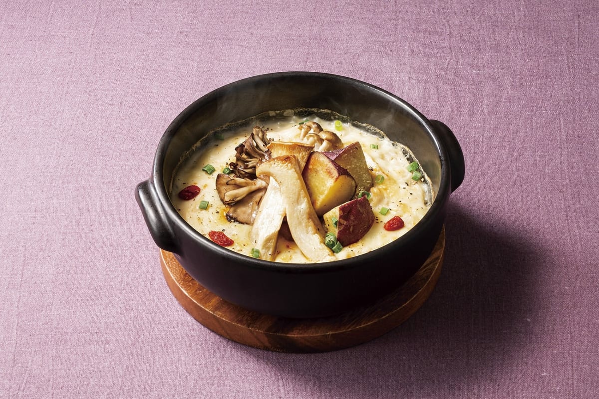 トッピングは、秋を感じさせるエリンギ、ぶなしめじ、まいたけ、さつまいも、しっとり柔らかなハーブ鶏で、タンパク質もしっかりと補えます。