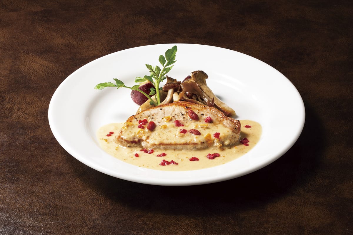白ワインと白醤油で旨味を引きだしたクリームソースは、ジューシーに焼き上げた豚ロースと相性抜群です。