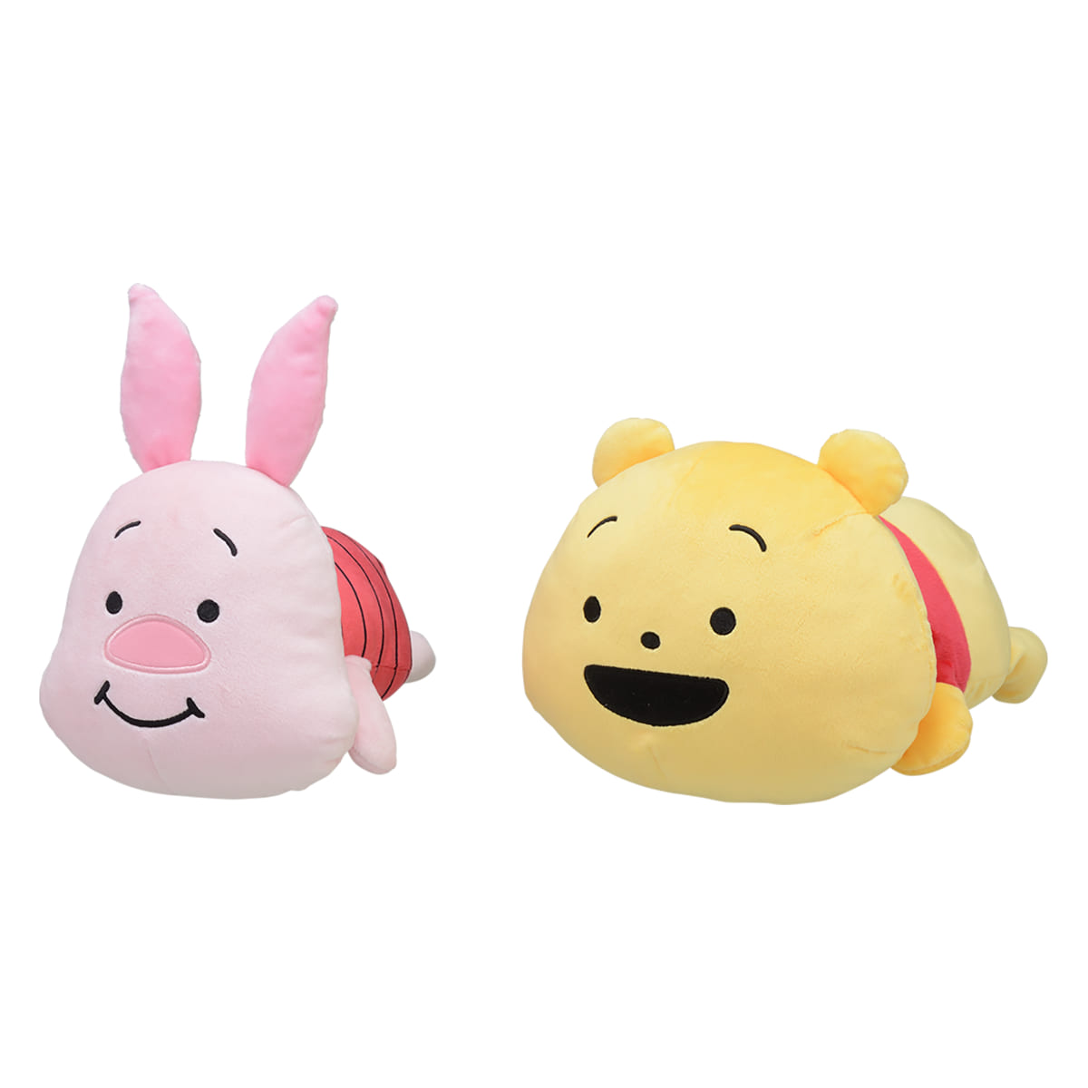 独特なタッチで描かれたユニークな表情の「プーさん」と「ピグレット」が寝そべり姿になったぬいぐるみです。