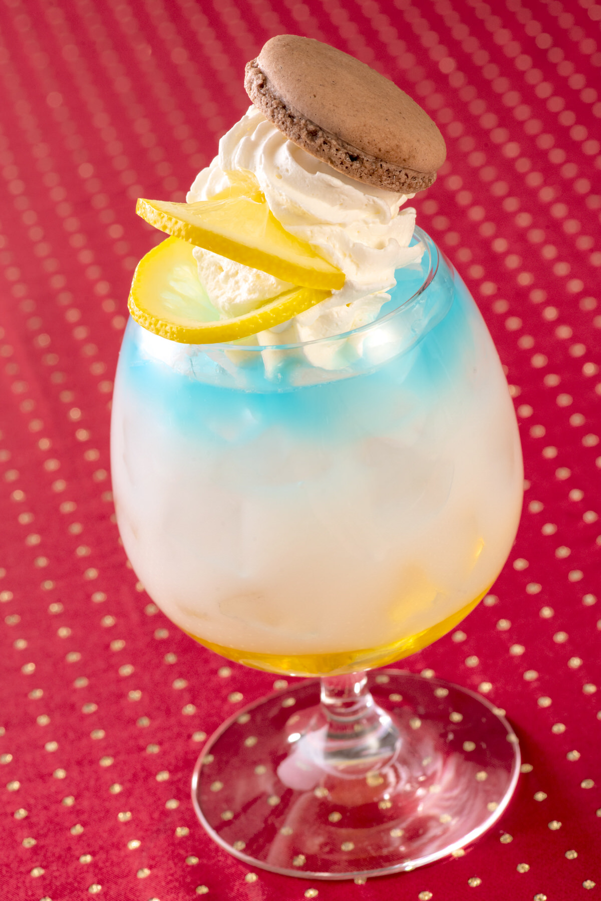 • カルピス、パッションフルーツシロップ、ブルーシロップ、ホイップクリーム、マカロン、レモン