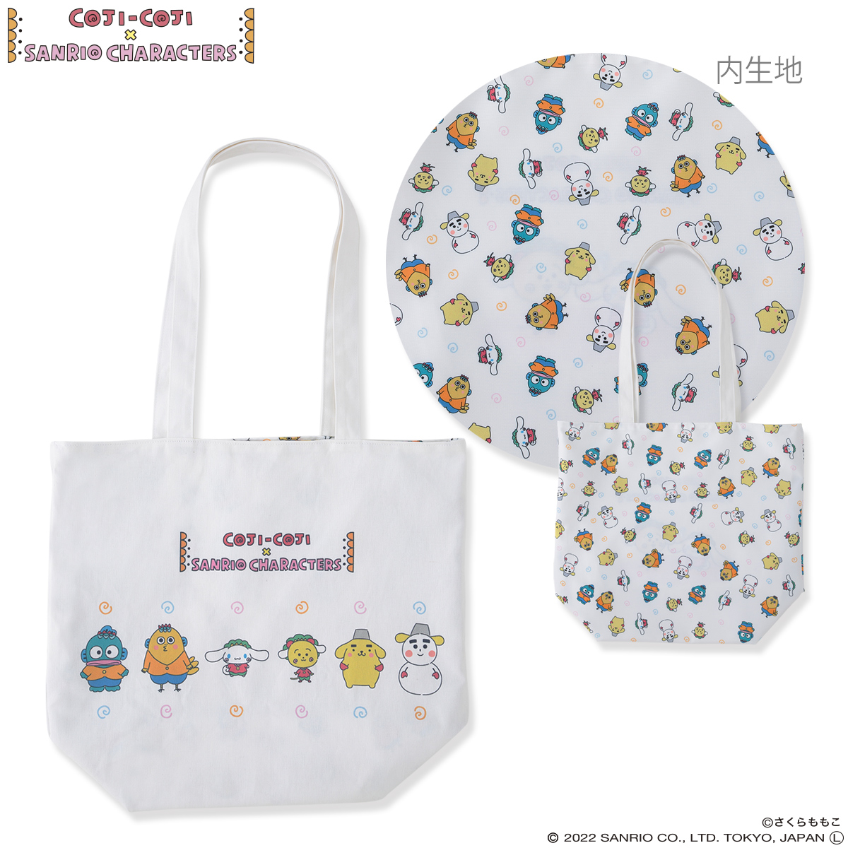 前面にロゴ、背面に「コジコジ」「次郎」「シナモロール」「ハンギョドン」が描かれたタイプと、