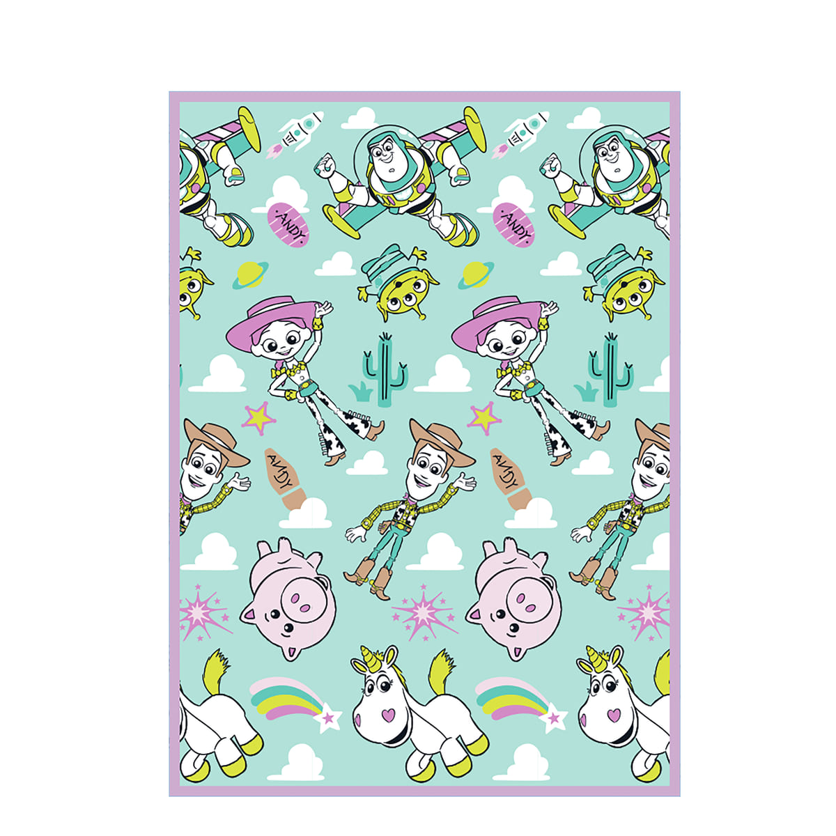 「トイ・ストーリー」シリーズに登場するキャラクターが描かれた、ふわふわ生地の大きな毛布。