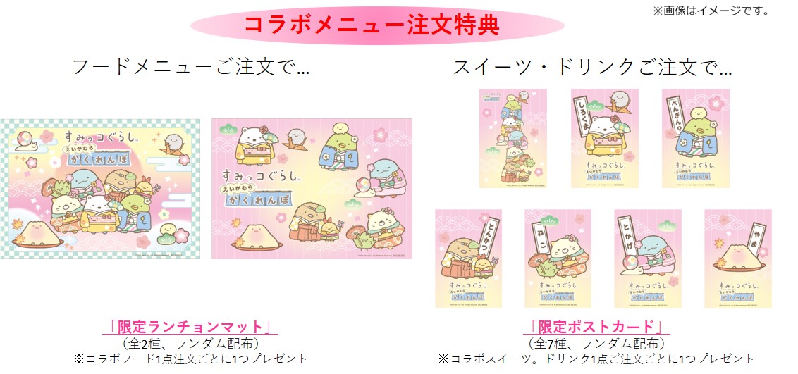 フードメニューは「限定ランチョンマット」、スイーツ&ドリンクメニューは「限定ポストカード」が、それぞれ注文特典としてもらえます!