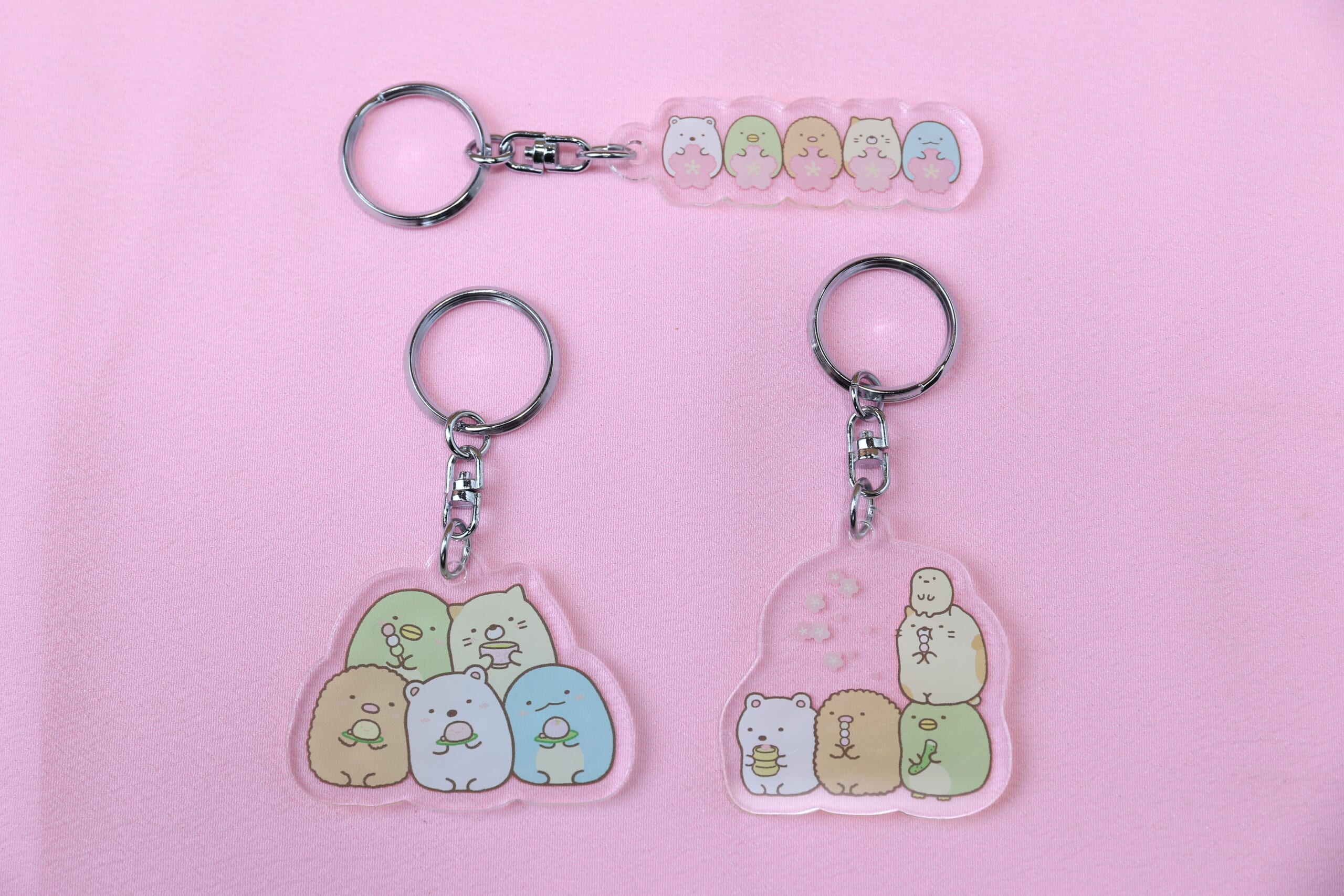 さくらや和菓子、お茶を手にした「すみっコ」たちのアクリルキーホルダーです。