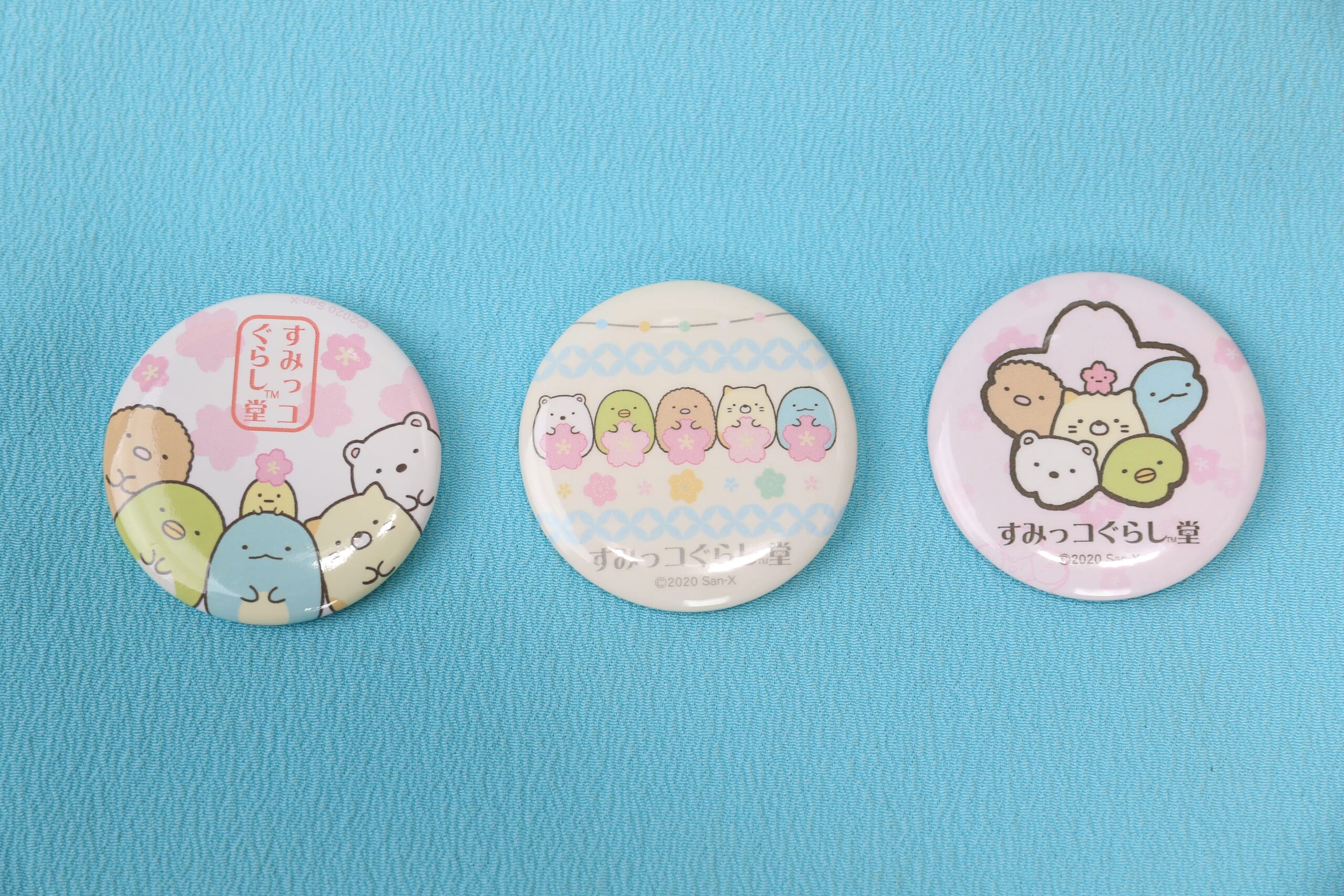 「すみっコぐらし堂」のロゴ入り缶バッジ。