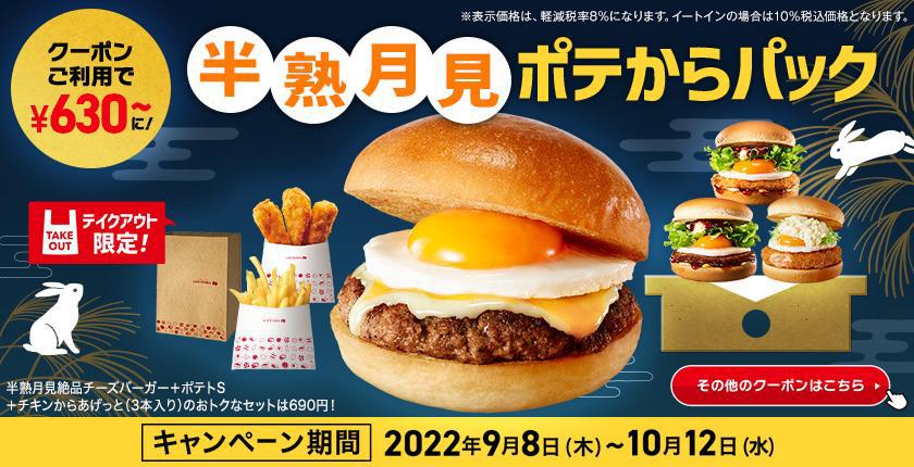 この時期だけの「半熟月見絶品チーズバーガー」「半熟月見エビバーガー」「半熟タマてりバーガー」「半熟タマてりチキンバーガー」が、テイクアウト限定パックでお得に楽しめます!