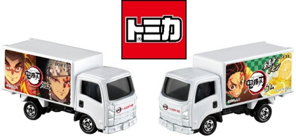 テレビアニメ「鬼滅の刃」のロゴとロッテのロゴがフロントにデザインされたオリジナルトミカ。