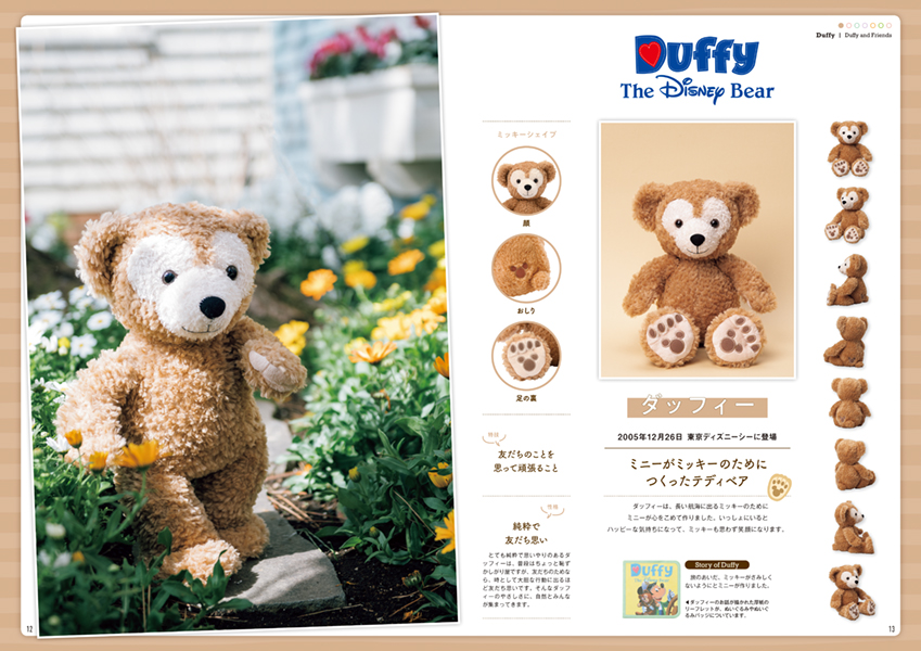ダッフィー、シェリーメイ、ジェラトーニ、ステラ・ルー、クッキー・アン、オル・メル、リーナ・ベルの撮り下ろし写真と共に、詳しいプロフィールが掲載されています。