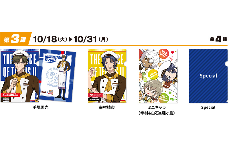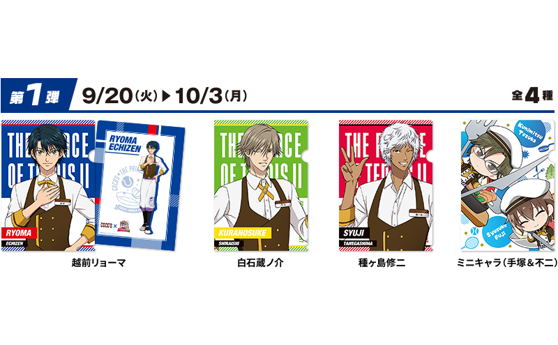 2022年9月20日(火)から10月3日(月)までの第1弾では、「越前リョーマ」「白石蔵ノ介」「種ヶ島修二」「ミニキャラ(手塚&不二)」の全4種のクリアファイルが登場。