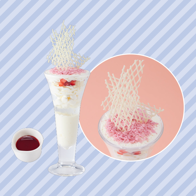 マシュマロ、バニラアイス、バナナなど白い食材で、プランスの好きな純白に仕上げたパフェに、ヒロイン「竜崎桜乃」をイメージさせるピンクや赤を、フィアンティーヌやフローズンストロベリーで表現することで、「竜崎桜乃」に恋するプランスをイメージ。
