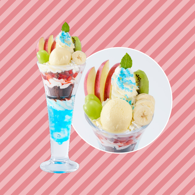 ブルーシロップの色合いが目を引く、フレッシュフルーツを贅沢に使用したパフェ。