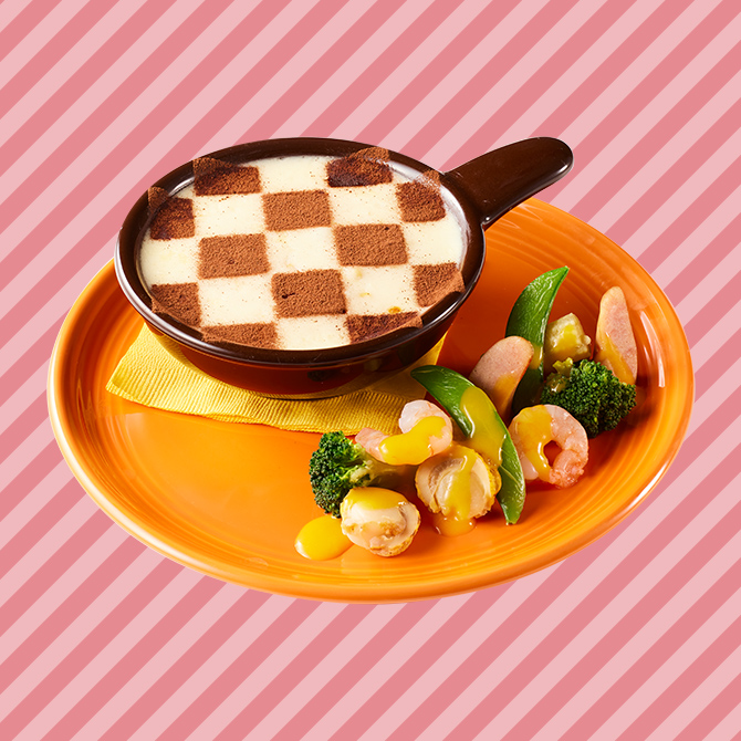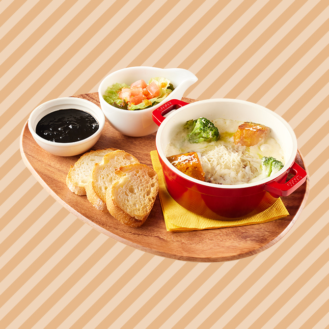 トマト風味のソースが、まろやかなチーズフォンデュの味わいに爽やかな酸味をプラスし、味の変化が楽しめます。