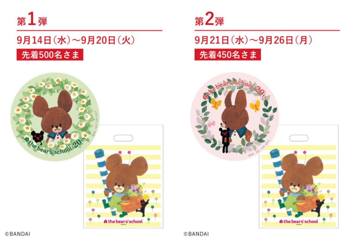 「くまのがっこう20周年記念ステッカー」と「くまのがっこうビニールショッパー」を1枚ずつプレゼント!