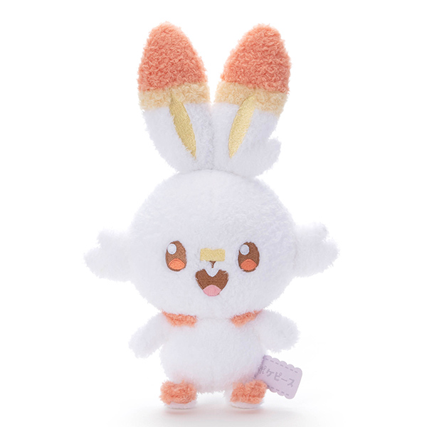 白い体にオレンジの模様が特徴的な「ヒバニー」のぬいぐるみ。