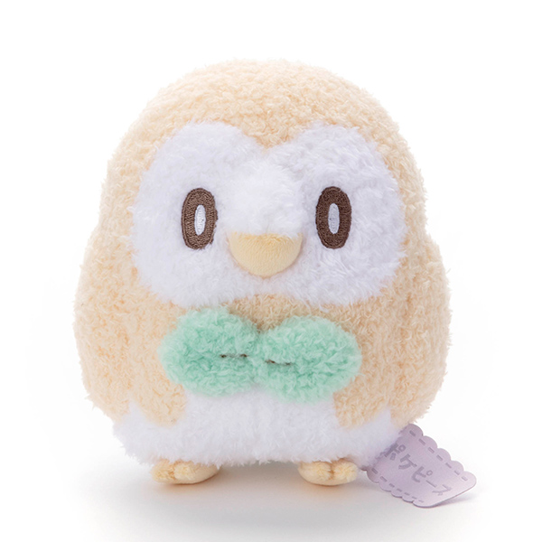 丸い姿に蝶ネクタイのような葉っぱが特徴的な「モクロー」のぬいぐるみ。