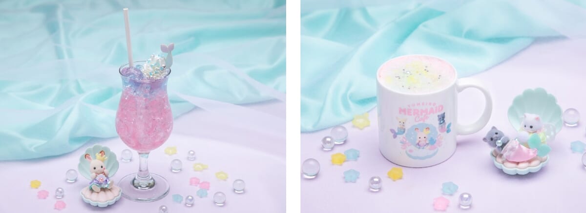 マーメイドプリンセスになったショコラウサギの赤ちゃんクレムをイメージしたパフェ、ゆめいろマーメイドの世界感あふれるドリンクなども提供されます。