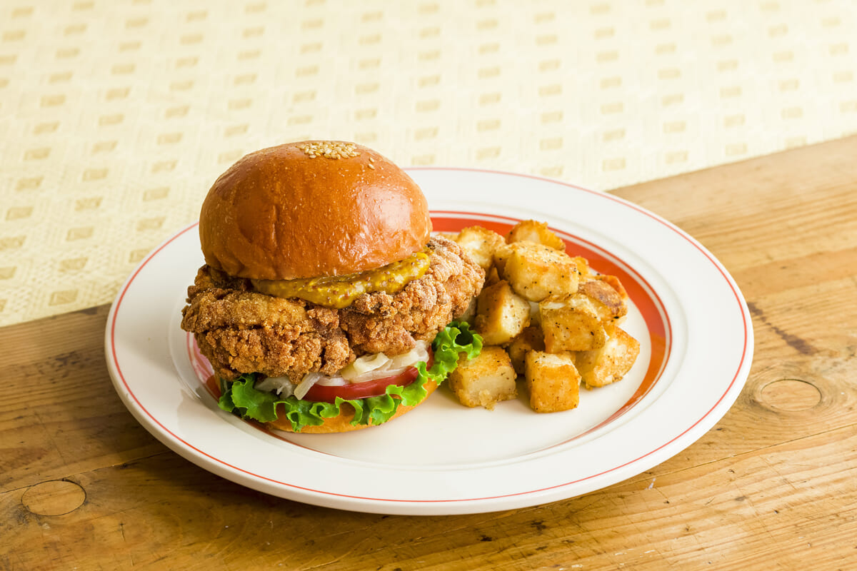 人気のモチコフライドチキンとハニーマスタードを、香りの良いブリオッシュバンズで挟んだバーガー。