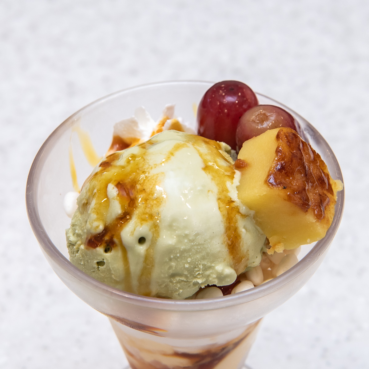 かっぱ寿司オリジナルのピスタチオアイスが存分に楽しめるパフェ。