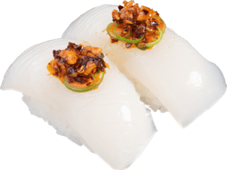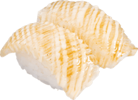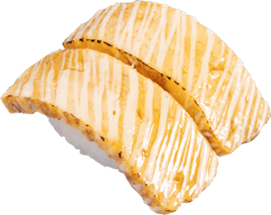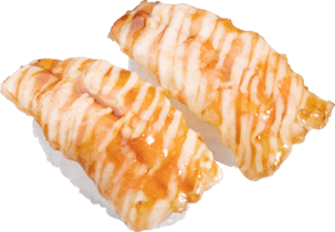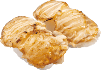 人気の浜焼きのタレとマヨネーズをかけて炙ったホタテ寿司。