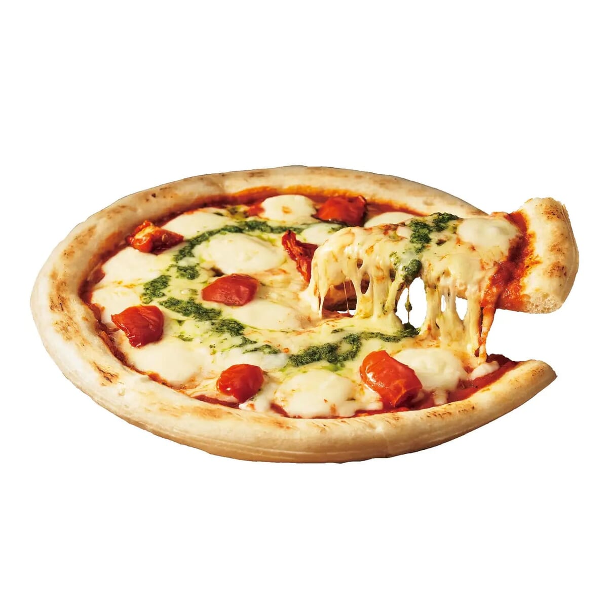 ダイス状にカットした北海道産のモッツァレラチーズをトッピングし、セミドライトマトとバジルソースで仕上げたピザです。