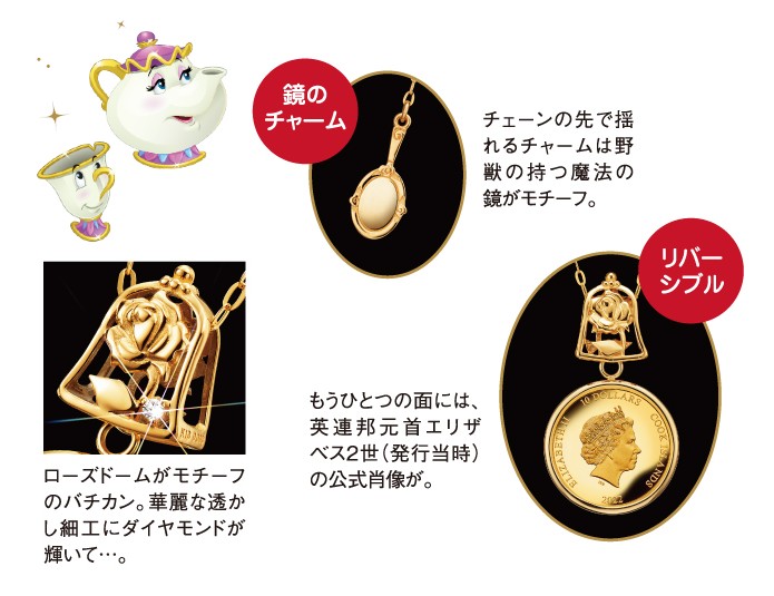 チェーンの先で揺れるチャームには、野獣の持つ魔法の鏡があしらわれ、劇中のローズドームを象ったバチカンには、永遠の美を象徴するダイヤモンドが清廉とした輝きを放ちます。
