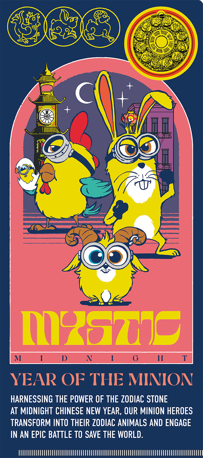 劇中のキーアイテム「ゾディアック・ストーン」によって鶏、うさぎ、羊に変身してしまった「ボブ」たちが描かれたユニークなデザインです。