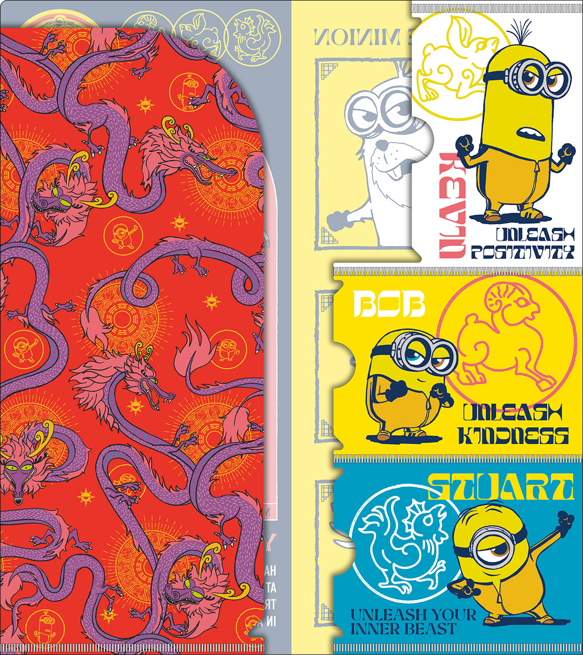 中面は、ドラゴンに変身した「ベル・ボトム」のパターン柄と、カンフースーツに身を包んだミニオンたちが描かれています。