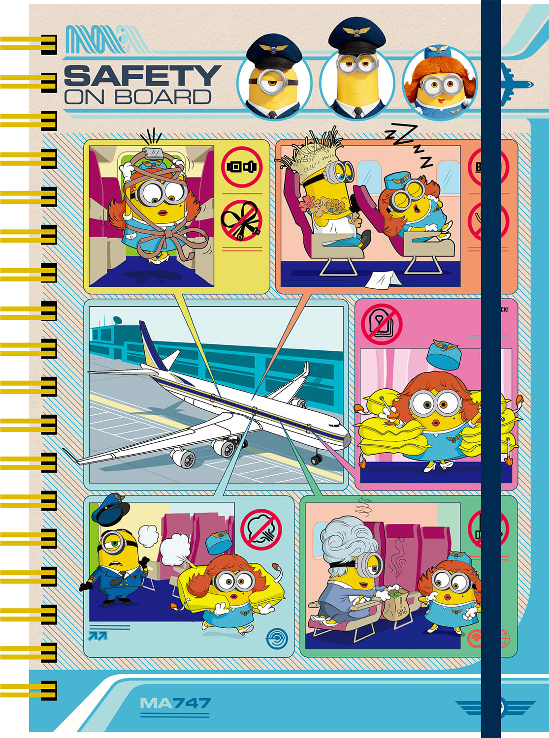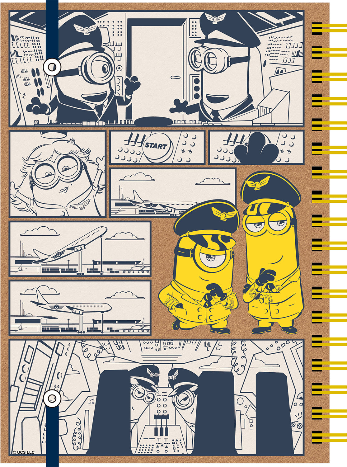 「グルー」救出に向かう「ボブ」たちが飛行機に乗る場面をカバーイラストで表現した「ゴムバンド付きリングノート」