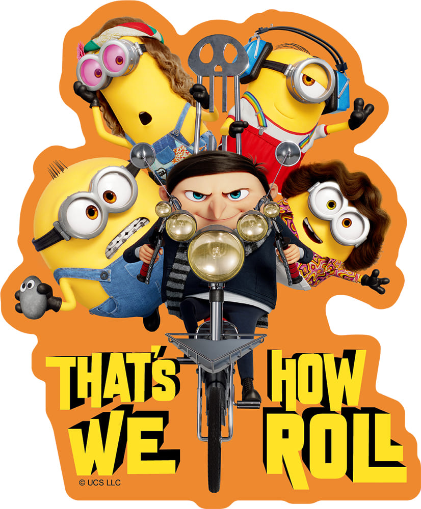 ロケット自転車に乗った「グルー」とミニオンたちのステッカー。