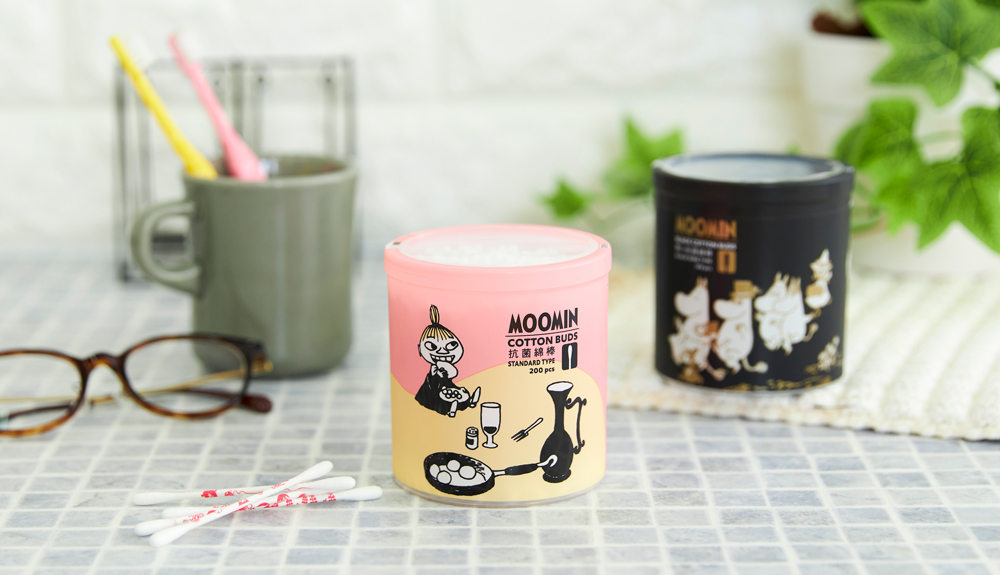 スタンダード形状の「MOOMIN 抗菌綿棒 200本」と黒色の綿を使用した「MOOMIN 黒い抗菌綿棒 150本」の2商品がラインナップ。
