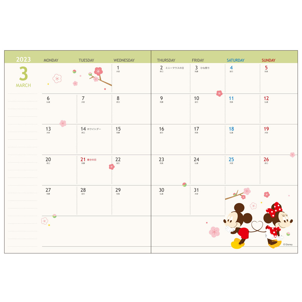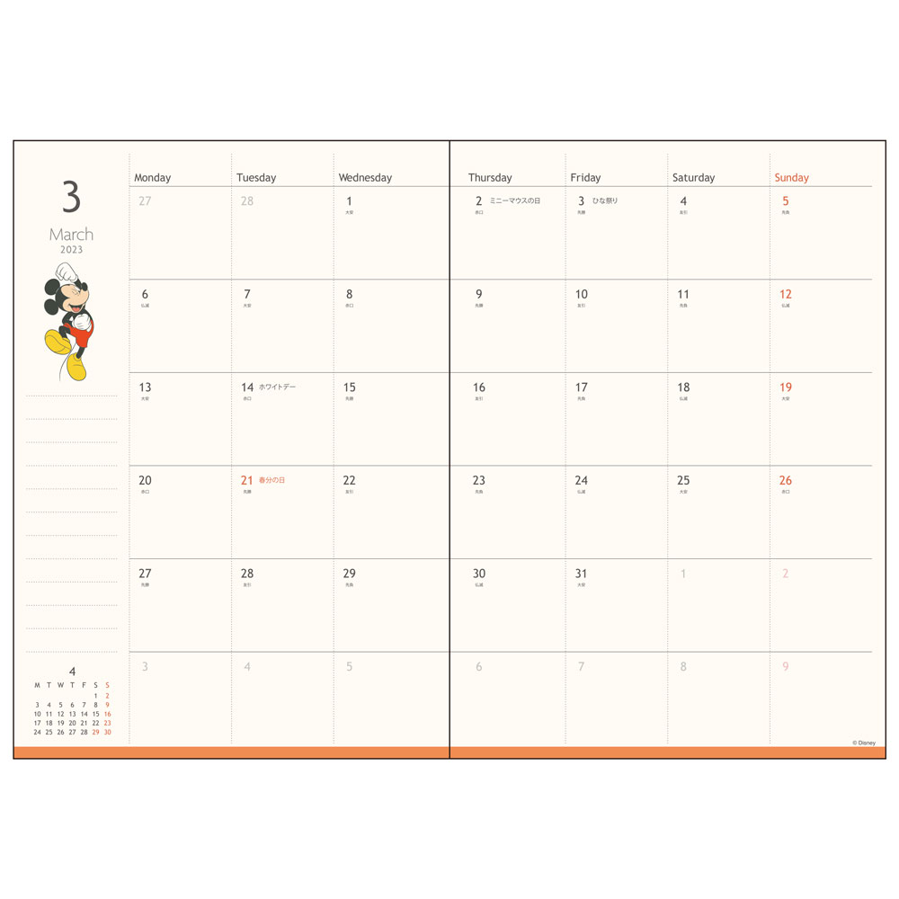 見開きの月間スケジュールには「ミッキー&フレンズ」と季節のモチーフのイラスト付き。