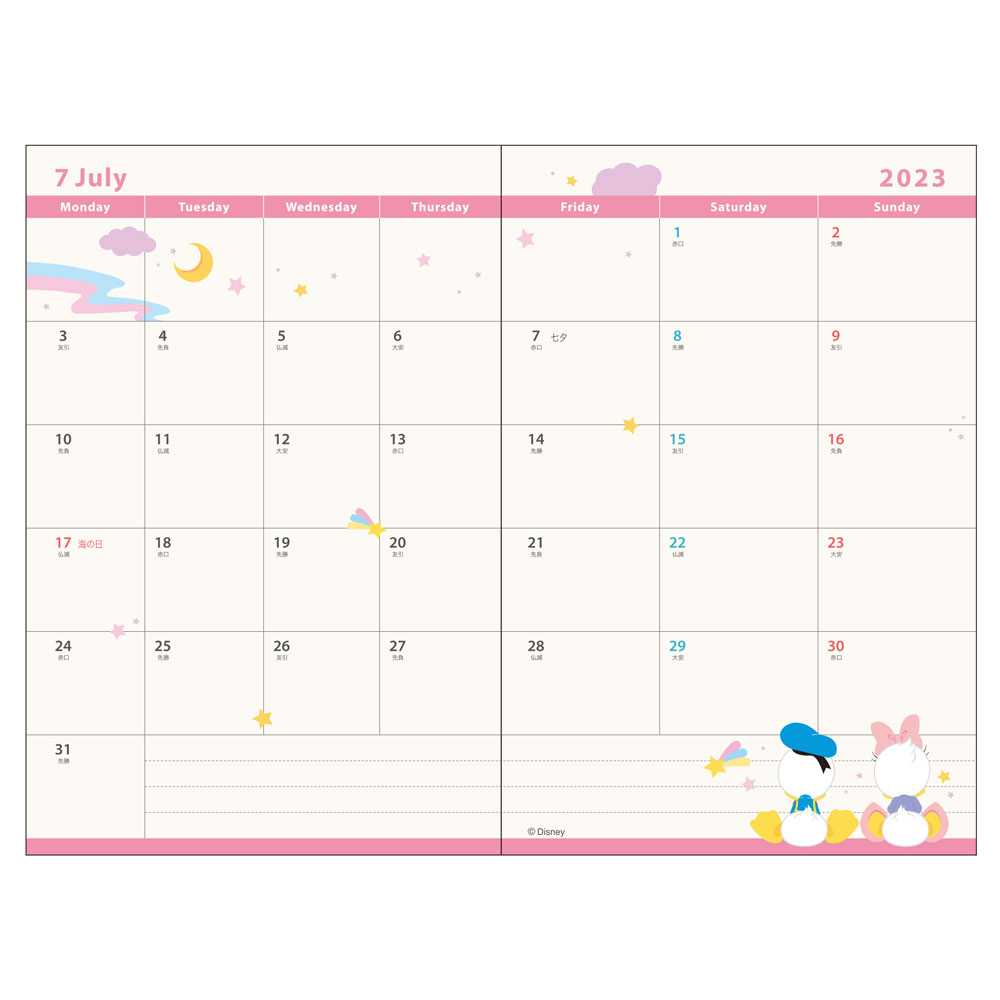 月間スケジュールはもちろん、フリーメモにも「ミッキーマウス」をはじめ「ドナルドダック」や「グーフィー」「プルート」たちの姿が。