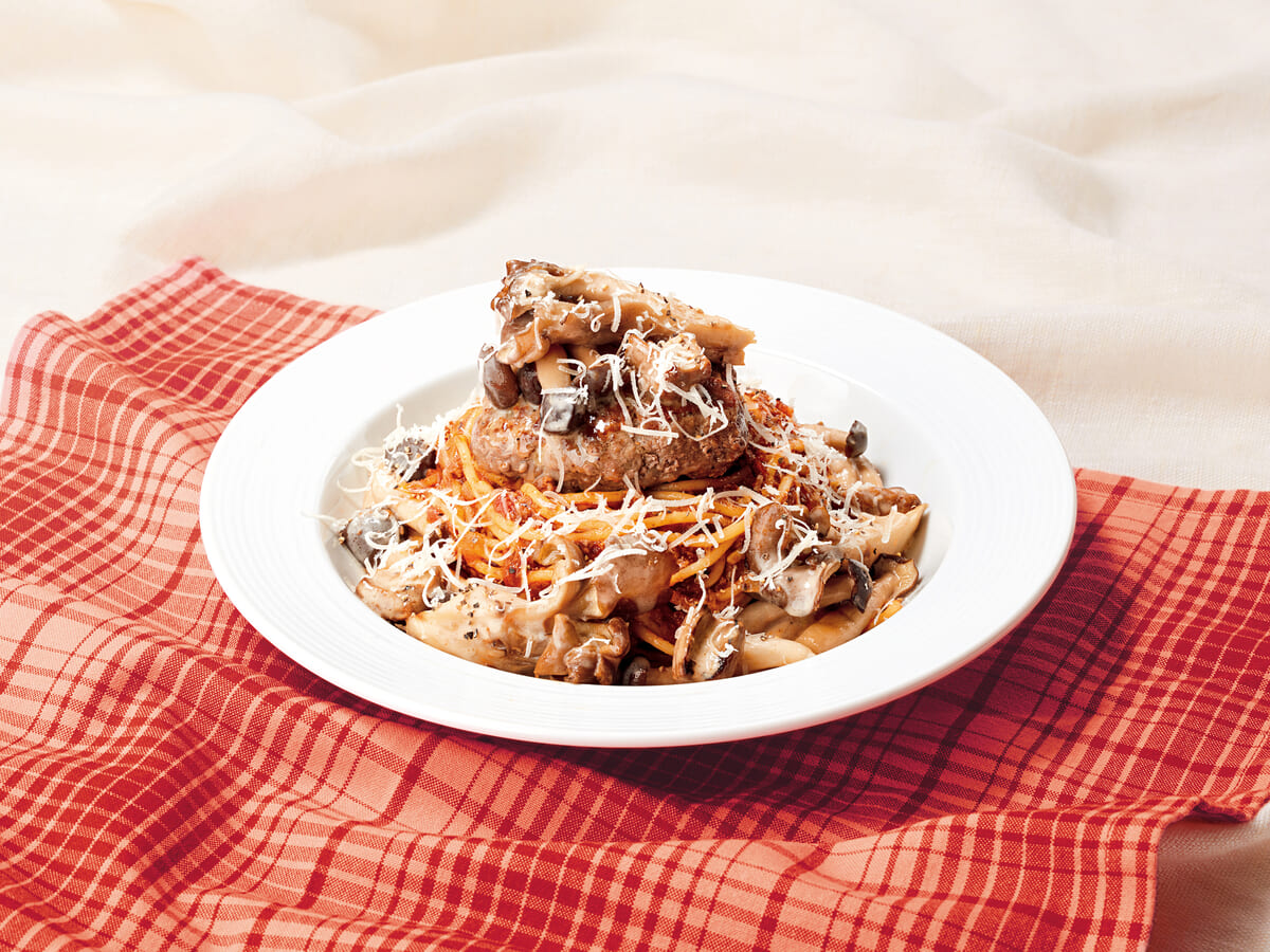 牛肉を100%使用したビーフハンバーグをのせたボロネーゼに、3種のきのこがたっぷり入ったポルチーニ香るきのこクリームソースをかけたボリューム満点の一品。