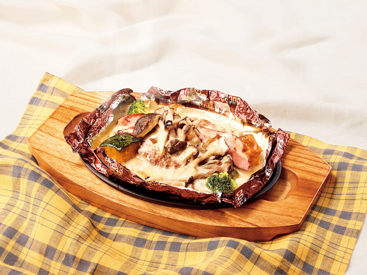 チーズが溶け込んだクリームソースに、ハンバーグや具材を絡めて秋の味覚たっぷりの包み焼きハンバーグを堪能できます。