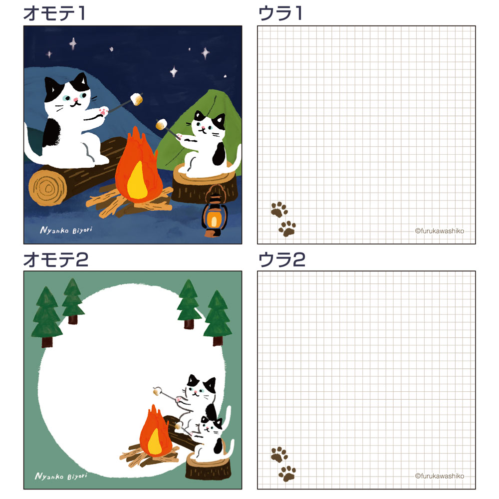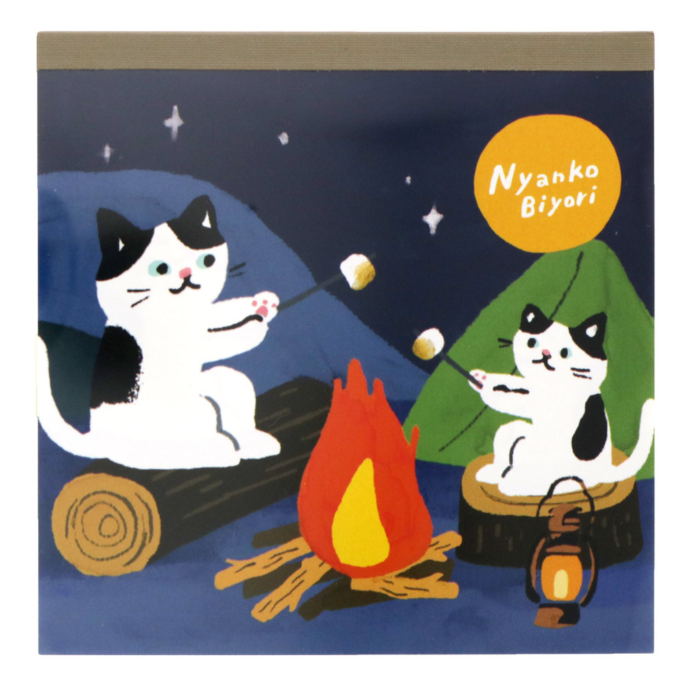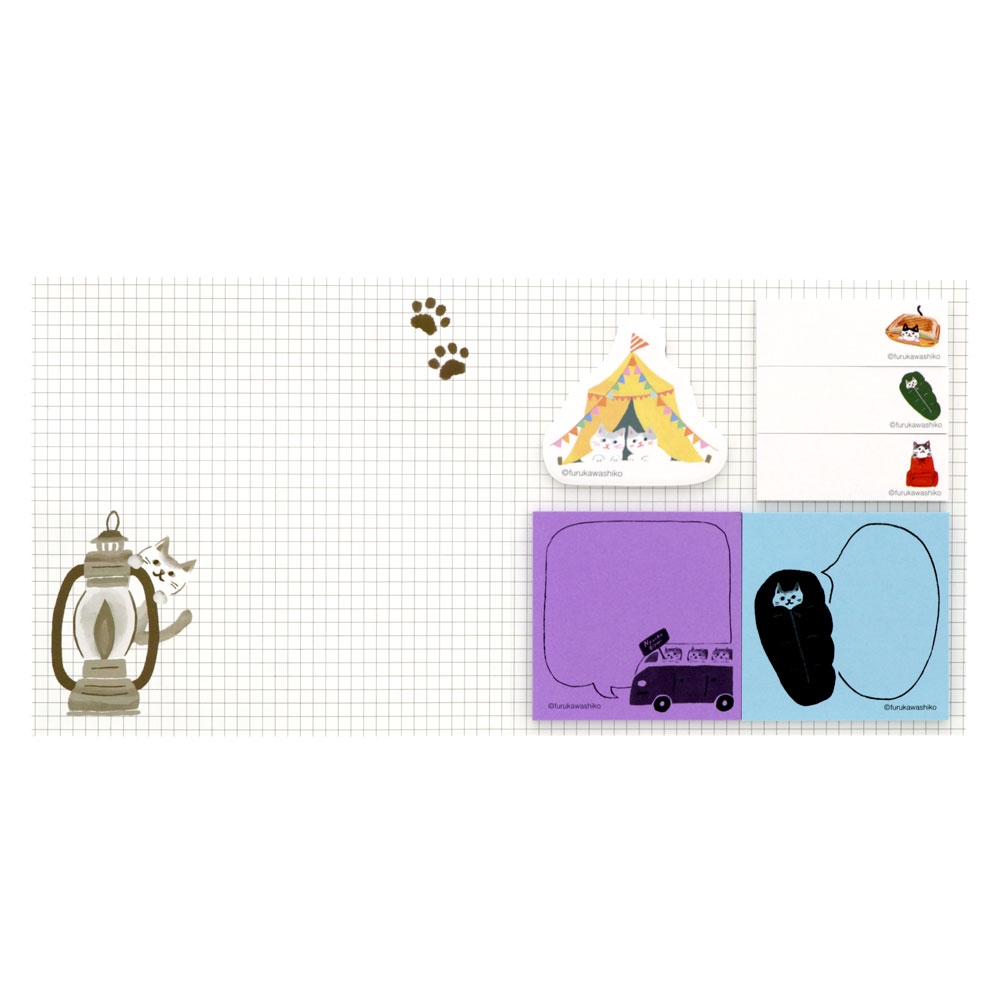 キャンプを楽しむネコが描かれた、絵本の表紙のようなイラストが愛らしい付箋。