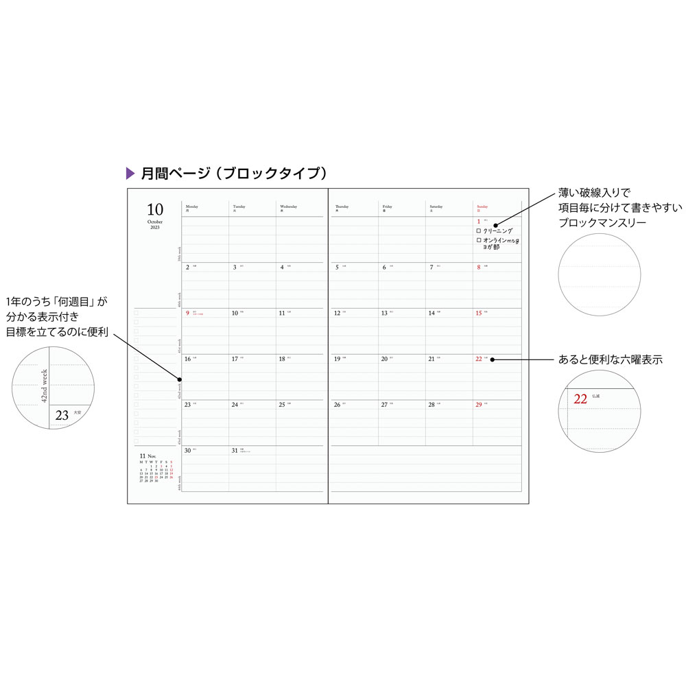 内容:カレンダー、年間プラン、月間スケジュール(2022年10月~2023年12月・六曜入)、週間スケジュール(2022年10月~2023年12月)、メモ、アドレス、マナー情報、世界地図、路線図