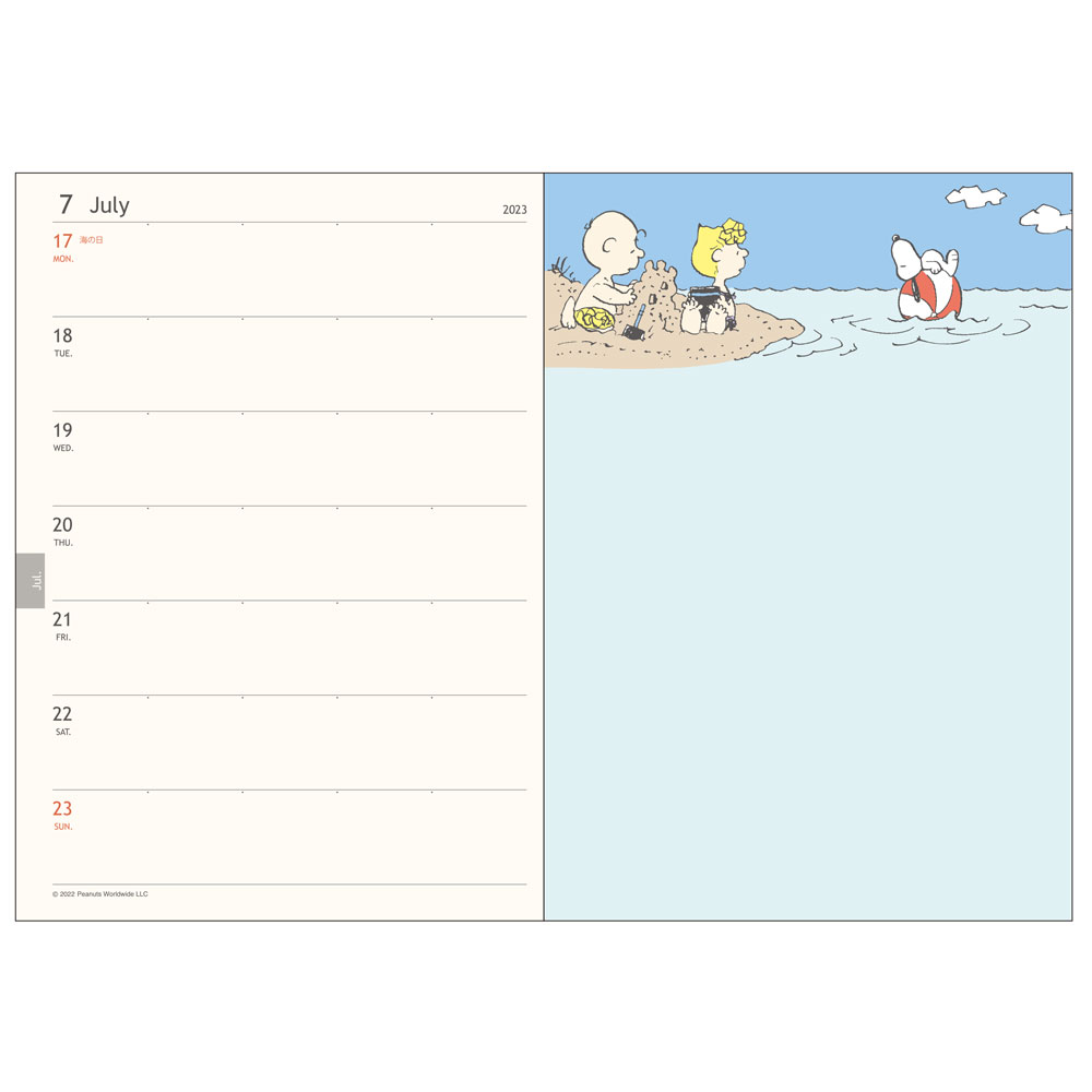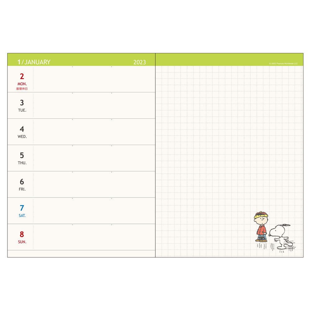 週間ページの右側は、『PEANUTS』のキャラクターの世界観が詰まったデザイン。