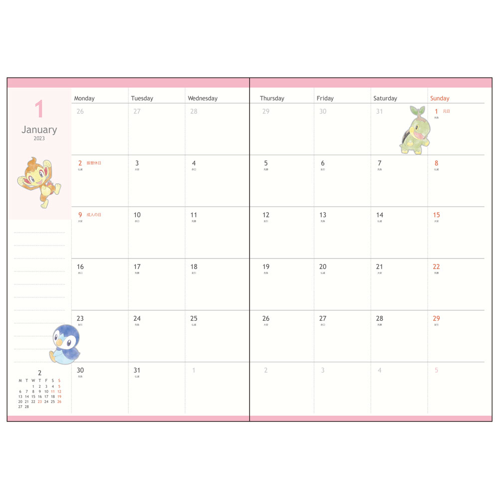 2023年手帳 月間B6 ポケットモンスター「くさタイプ」本文