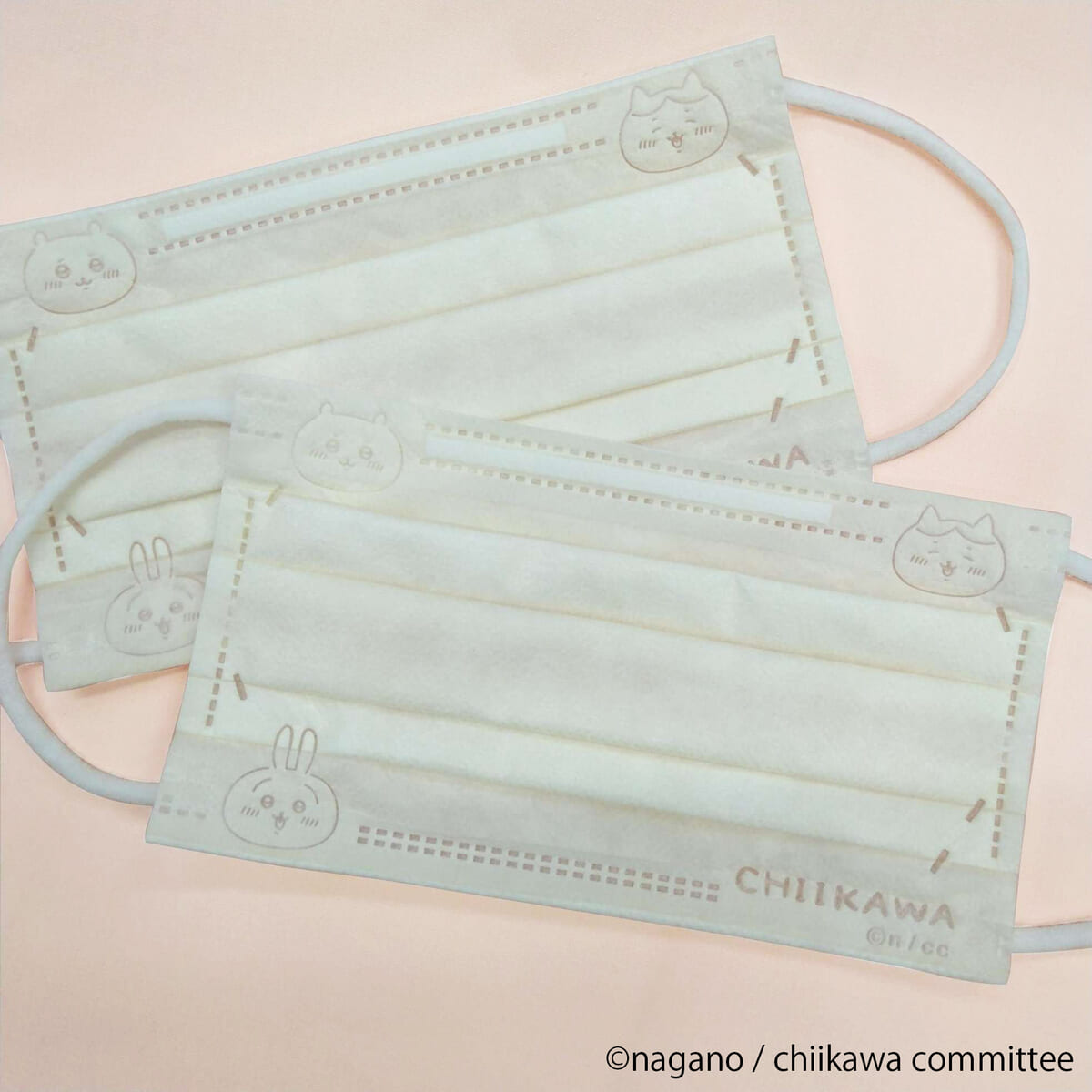 マスクに型押しされたエンボス柄は「ちいかわ」と仲間たちが個性豊かな表情で微笑み、どの角度から見てもかわいいデザインに。